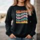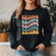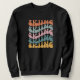 Ski Sweatshirt. © T-Shirts & Sweats bei Zazzle. Dieser Pullover hat das Wort Skiing wiederholt in Retro-Schriftart und verschiedenen Farben.