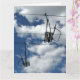 Zwei leere Skiliftstühle hängen von ihren Liftkabeln auf diesem beeindruckenden Foto. Ohne Fahrer sieht der Skilift wie ein schwarzes Lineardiagramm vor einem weiten Blick auf den blauen Himmel und die weißen puffigen Wolken aus. Der obere rechte Stuhl läuft bergauf und der untere links Stuhl kehrt bergab zurück. Digitales, Farbfoto. Copyright © 2010 Claire E. Skinner. Alle Rechte vorbehalten.