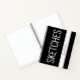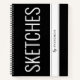 Personalisiertes Sketch-Notebook in Schwarz-Weiß für Kunst und zeichn mit einem großen Drucktitel von "Sketches by... und Ihr Name" auf dem Cover in einem modernen serifenlosen Schriftart gedruckt.