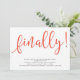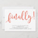Eine lustige Einladung zu einer Verlobungsfeier mit dem Wort "endlich!" in fett handgeschriebenem Schriftart und Party Details in modernen Sans Serif Schriftart. Der Text (einschließlich des Wortes 'schlussendlich') und die Hintergrundfarben können durch Klicken auf 'Weiter' geändert werden