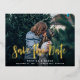 Eine moderne, Save the Date Postkarte, die für Ihr beliebtes, horizontal oder landschaftsorientiertes Vollblutkarton-Foto konzipiert ist. "Save the Date" erscheint am Ende Ihres Fotos in handgeschriebenen Schriftzeichen in Goldfolie, darunter Ihre Namen, Ihr Hochzeitstermin und Ihr Hochzeitsort. Postkarten werden zurückgesetzt, um zusätzliche Save the Date Details, einschließlich Ihrer Hochzeitswebsite, mit Ihrer Rücksendeadresse und Platz für die Empfänger-Adresse anzuzeigen.