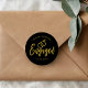 Ein lustiges und einzigartiges Gold gegen einen schwarzen, skriptbuchstabierten Aufkleber, der speziell auf Sie zugeschnitten ist, um eine Verlobungsfeier zu organisieren. Es enthält das Wort "verlobt" in Gold mit goldenen Hochzeitsringen. Unter diesem und darüber sind die Namen der Braut und des Bräutigams und das Datum der Verlobung.