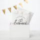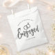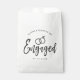 Ein lustiger und einzigartiger, mit Skripten gezeichneter Kraftbeutel, der speziell auf Sie zugeschnitten ist, um Ihre Verlobungsfeier zu organisieren. Es enthält das Wort "verlobt" mit den über ihm ruhenden Hochzeitsringen. Unter diesem und darüber sind die Namen der Braut und des Bräutigams und das Datum der Verlobung.