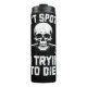 Diese edgy Grafik zeigt einen menschlichen Schädel mit einem Barbell im Mund, umgeben von kühlen, bedrückten Text. Das Design beinhaltet den düsteren und humorvollen Slogan "SPOT MIR NICHT, DASS ICH VERSUCHE, DIE" und schafft so ein witziges und rebellisches Statement-Stück für Gewichtsheben.