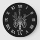 Diese spukhafte Uhr hat das Bild eines Schädels, der mit einem Kronleuchter geschmückt ist.
