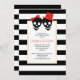 Die Elemente dieser zeitgenössischen roten Halloween Hochzeitsdusche sind ein lustiges schwarzes Schädelpaar mit rotem Bogen und Hut gepaart mit einem eleganten Schwarz-Weiß-Rahmen. Ihr Text ist in einem weißen Rahmen mit goldener Kontur.
