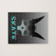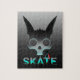 Skull Graffiti Skater Cat, Der schelhafte urbane Superheld, Ska Punk coole Katze Ferzio, auf einem neonglühenden Skate Plakatschild Spray Malerei einige Graffiti eines Katzenschädels.