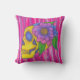 Pink and purple skull print throw pillow features an abstract line art style skull with a flower head piece, in shades of yellow, green , pink , purple, and blue, against a pink and purple abstract striped background. Original ink and pencil artwork and digital artwork by The Gifted Grackle.