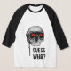 Grosses Bild eines menschlichen Schädels hinter der Maskerade. Rote Augen. Ein Text Ratet Wer? unter dem Bild. Weißer oder heller Hintergrund. Anpassbarer männlicher T - Shirt. Sie können das Bild ändern und den Vorlagentext ändern oder löschen. Verwenden Sie die Schaltfläche Anpassen, um das Produkt auf Ihre Bedürfnisse abzustimmen. Sie können zum Beispiel die Schriftart und die Farbe des Schriftartes ändern. Vergessen Sie nicht, einen anderen Stil, Farbe, Größe und Geschlecht der Bekleidung wählen, mehr als 150 Designs sind verfügbar. Gut für ein Halloween-Party. Pflege sie alle.