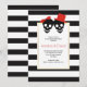 Diese schöne Halloween Hochzeitsfeier lädt mit ein paar Schädeln und schwarz-weißen Streifen zusammen. Der Bräutigam trägt einen roten Hut und die Braut einen roten Bogen. Ihr Text ist in einem weißen Rahmen mit goldener Kontur. Die Rückseite weist ein schwarz-weiß gestreiftes Muster auf.