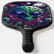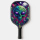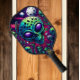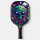 Ein Pickleball-Paddel mit einem lebhaften Bild eines Schädels und Alien-Köpfen, das ein surreales und anderweitig weltliches Design schafft.