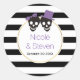 Moderne Schädel und Schwarz-weiße Streifen lila Halloween Hochzeit Save the Date Aufkleber. Es zeigt ein schwarz-weiß gestreiftes Muster, einen weißen Kreis in der Mitte mit Ihrem Text und ein lustiges Schädelpaar in lila und schwarz die Braut mit einem Bogen, der Bräutigam mit einem Hut.
