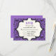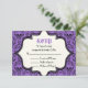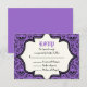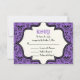 Skulls verdammt lila schwarzes Muster Halloween Hochzeit RSVP Antwort/Antwort Karte. Dieses formale, elegante Design besticht durch ein Damast-Blumenmuster und Schädelmuster sowie durch einen Elfenbeinrahmen in der Mitte. Klassisches, aber zeitgemäßes Design mit zwei Schriftart: einem Vintagen und einem coolen. Elegantes, sprichwörtliches Design, perfekt für gotische oder Halloween-Hochzeiten im Herbst.