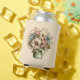 Ein Dosenkühler mit einem süßen Bild. Blaue, rosa und cremefarbene Blumen mit grünen Blättern. Eingestellt in einen grünen Blumenkübel mit einem grünen karierten Tuch, das über die Seite hängt.