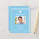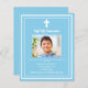 Ein himmelblauer Hintergrund, mit weißem Rahmen dekoriert, und ein weißes Kreuz Persönlich und fügen einen Namen und Details des Fotos hinzu. Weißer Text. 1 Blatt = 1 Einladung mit Druckkante bis Kante.