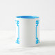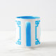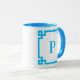 Dekorativer, weißer und blauer griechischer Schlüsselrahmen mit einem modernen Serifenmonogramm. Passen Sie dieses zeitgenössische Design an, indem Sie Ihre Lieblingsfarbe auswählen. Ändern Sie bei Bedarf den Stil, die Größe oder die Farbe des Schriftartes. Bevorzugen Sie nur eine Seite Ihrer Tasse mit Monogramm? Sie können auch eines der ersten Designs auf beiden Seiten der Tasse löschen.