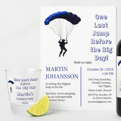 Feiern Sie den letzten großen Sprung vor der Hochzeit mit unserer Bachelor Party Collection! Von fetten Fallschirm-Grafiken bis hin zu lustigen Adrenalin-inspiriert Slogans - diese Kollektion ist für Nervenkitzel suchende Bräuche und deren Crew konzipiert. Diese individuell gestaltbaren Produkte sind ideal für ein hochenergetisches und unvergessliches Event und bringen die Spannung des Skydiving direkt ins Party.
