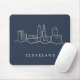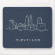 Eine Skizze der Cleveland-Skyline auf einem blauen Hintergrund mit Text unten