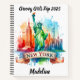Eine lebendige Abbildung zeigt New York City, die Freiheitsstatue mit ikonischen Wolkenkratzern wie dem Empire State Gebäude vermischt und so das Wesen dieser dynamischen Metropole abbildet. HINWEIS zum Ändern von Textfarben Verwenden des Entwurfstools Bearbeiten