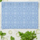 Eine harmonische Mischung linearer geometrischer Muster, die an eine ruhige Skyline der Stadt erinnern, mit zarten Sternen und sanften Sonnenburgen in blass blauen Farbtönen verziert