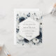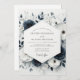 This elegant design features a dramatic and moody botanical arrangement. Lush, inky slate blue and soft white watercolor roses are beautifully complemented by delicate anemones with dark centers. Sprays of dusty blue foliage soften the composition, creating a romantic, painterly, and sophisticated aesthetic for a memorable union.