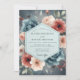Embrace a dramatic and romantic atmosphere with this stunning artistic design. Lush, painterly bouquets feature peonies and ranunculus in rich slate blue, warm rust, and soft blush tones. Set against a deep, somber background, the floral arrangement creates a beautiful and moody contrast perfect for an elegant affair.