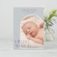 Diese elegante vertikale Geburtsankündigung mit einem modernen bogenförmigen Foto und sanften, neutralen Blautönen in den Farbtönen der Fotos. Die Phrase "Hello, World" teilt Ihre Freude mit klassischen Typografie-Details. Auf der Rückseite ist eine dunklere Tonfarbe mit Platz für ein horizontales Foto und eine Familiennachricht.