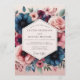 A romantic and elegant floral design features a lush arrangement of blossoms. The color palette combines deep slate blue, dusty blush pink, and rich burgundy for a dramatic, moody effect. Painterly anemones with dark centers are nestled amongst soft, delicate roses and subtle greenery against a pale, warm background.