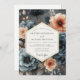 Embrace a mood of lyrical romance with this stunning artistic floral composition. Beautiful anemones in deep slate blue and delicate blossoms in soft peach bloom against a dramatic charcoal background. The painterly watercolor effect adds a layer of sophisticated artistry. This design is perfect for an elegant, moody, and romantic union.