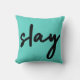 Einfaches, stilvolles, trendiges "slay" urbanes Zitat-Kunstkissen in moderner minimalistischer Handschrift-Stil Typografie in schwarz auf einem cyan grünen Hintergrund inspiriert von Schönheit, phantastisch aussehen, töten es und Mädchen Power!