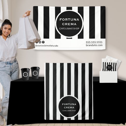 Elevate your business presence with our black and white striped business thank you sticker. Perfect for brand packaging, marketing events, vendor events, and even as a thoughtful touch for gifts, this chic striped sticker is a must-have for creating a lasting impression. Features a background pattern of wide black and white stripes with a round black frame in the center to feature your business name, tagline, and website in elegant white text. Make a statement with every interaction and let this modern business card speak volumes about your brands' dedication to quality and style.