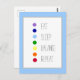 Charmantes minimalistisches Wellness-Postkartendesign mit einer einfachen 7-Chakra-Grafik und individualisierbarem "Eat. Schlafen. Guthaben an. Wiederholen." Nachricht und himmelblau Rahmen. Ideal für Yogalehrer, Massagetherapeuten und andere, die ganzheitliche Wellness und Meditation praktizieren.