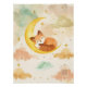 Drift into dreamland with this watercolor nursery print featuring a sleeping baby fox curled up on a glowing crescent moon, surrounded by soft clouds and twinkling golden stars. Gentle hues of sage green, blush peach, pale yellow, and cream blend together in soothing watercolor tones that create a peaceful, gender-neutral nursery atmosphere.