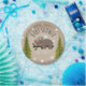 Eine Babyduschplatte mit einer Abbildung eines schläfrigen Bären auf einem Baumzweig, umgeben von Sternen zwischen zwei immergrünen Bäumen auf einem inspirierten Kardangelboden. Der Bär trägt eine Blume.