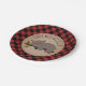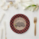 Babyduschpapier-Teller mit einer Abbildung eines Babybärenkuchens in Schlafstellung auf einem Baumzweig mit kariertem Hintergrund aus rotem und schwarzem Lumberjack.