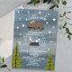 Eine Babydusche-Einladung, in der ein Babybär auf einem von Sternen umgebenen Zweig untergebracht ist. Bergbild und Bäume ganz unten. Personalisieren Sie den Text. Hintergrund ist dunkelblaue Wasserfarbe inspiriert. Der Bär trägt eine Blume.