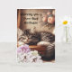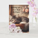 Perfekte Karte für einen Katzenliebhaber. Ein schläfriges Kätzchen auf einem Koffer mit Blume um sie herum. Sie träumt vom purpuren Geburtstag!
