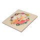 Ein schlafender Fuchs wird in einem hübschen boho-artigen Blumenkranz im Aquarellbild auf dieser Kachel aufgerollt. Die Farbtöne im Bild sind rot-orange, goldfarben, creme, lila violett, rosa, braun und grün. Das Bild wird auf einem hellen oder beigen Hintergrund platziert.