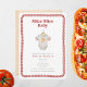 "Slice Slice Baby" Pizzadesign Babydusche mit Darstellung eines Babybodysuit mit rot gestreiften Ärmeln und Abbildung der Pizza in der Mitte. Die Grenze ist ein handgezeichnetes rotes Schachbrettmuster mit abgerundeten Ecken.