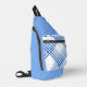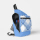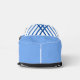 Pocket hat einen weißen Hintergrund und zeigt blaue Linien in verschiedenen fünf Farbtönen, dunkel bis hell, von unten nach oben. Zwei Sets Streifen werden diagonal platziert, treffen sich in der Mitte von oben und unten. Diese beiden Sets werden dann repliziert und gedreht, sodass sie überqueren. Die Mehrheit der Tasche ist eine solide Farbe der mittlere blaue Ton.