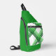 Pocket hat einen weißen Hintergrund und zeigt grüne Linien in verschiedenen fünf Tönen, dunkel bis hell, von unten nach oben. Zwei Sets Streifen werden diagonal platziert, treffen sich in der Mitte von oben und unten. Diese beiden Sets werden dann repliziert und gedreht, sodass sie überqueren. Die Mehrheit der Tasche ist eine solide Farbe der mittlere grüne Ton.