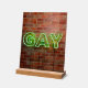 SlipperyJoe leuchtete schwulenneonsignatur leuchtend lebendig grüne Leuchtbriefe montiert rotbraunen Backstein Wand Gay Pride Geschenke Identität feiern LGBTQIA städtische industrielle Look Feier Liebe Identität Gemeinschaft leben Ihre Wahrheitswahrheit Power lebhafte Glanz Kontraste strukturierte Hintergrund schlanke elektrische Kurven Gießen lebendige Aura