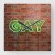 SlipperyJoe leuchtete schwulenneonsignatur leuchtend lebendig grüne Leuchtbriefe montiert rotbraunen Backstein Wand Gay Pride Geschenke Identität feiern LGBTQIA städtische industrielle Look Feier Liebe Identität Gemeinschaft leben Ihre Wahrheitswahrheit Power lebhafte Glanz Kontraste strukturierte Hintergrund schlanke elektrische Kurven Gießen lebendige Aura