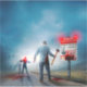 SlipperyJoe's fröhliche Halloween-glühende Augen Zombies Ausbruch Quarantäne-Zeichen männliche Überlebende stehen Vordergrundinfektion Gasmaske-Flugzeuge platzierten Blutflecken mysteriöse Figuren postapokalyptische zombie-infizierte Welt, bewaffnet mit Vorschlaghammer für den Kampf künstlerisch dunkler Himmel trostlose Landschaft LGBTQIA Gay Pride Geschengeschenke