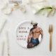 SlipperyJoe's rettend Pferderückfahrt Strohhut, der muskulöser Mann ohne Rumpf, der den Sattel mit einem gut definierten, körperlich geziselten Sechserpack hält, der den Sattel mit schwarzem Gürtel in silbernen Schnallen-Rändelmuskeln in den Artisten-Western-Vibe kelt, die LGBTQIA-Jeans