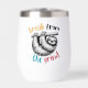 Ein Weinhändler mit der Phrase "Break from the Grind" in fetten Buchstaben, begleitet von einer Grafik eines entspannten Schlamms, symbolisiert einen langsamen, sorglosen Lebensstil und die Wichtigkeit, Zeit für sich selbst zu nehmen.