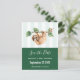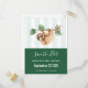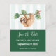 Save the Date Geburtstag / Babydusche / andere Veranstaltung Postkarte mit einem bezaubernden Hang, der von einem Baumzweig auf den Kopf hängt. Der Baumzweig ist mit tropischen Blätter und Beeren dekoriert. Set auf einem hellgrün-weiß gestreiften Hintergrund.