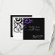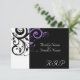 Kleine RSVP-Karte, um unsere lila, schwarz-weiße, rückwärts wirbelnde Hochzeitseinladung mit fett grafischem Swirl-Blätterhintergrund zu erfüllen. Passen Sie Ihre Hochzeitsdetails online an.