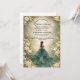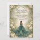 Dieses elegante Quinceañera-Design zeigt einen sanften smaragdgrünen Wasserfarbhintergrund, der von romantischen elfenbeinfarbenen Rosen, zartem Grün und dezenten goldenen Akzenten umrahmt wird, mit einer eleganten Kleidillustration, die eine raffinierte, verzauberte Gartenatmosphäre schafft. Die reiche grüne Farbpalette in Kombination mit klassischen Blumen verleiht dem Design ein luxuriöses, aber dennoch jugendliches Gefühl, perfekt für eine zeitlose Quinceañera-Feier mit einer romantischen, naturinspirierten Ästhetik.