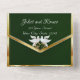 Smaragdgrün, goldene Blätter, Tauben & Herz - alles in einer Einladung. Romantische Hochzeitsthemen mit elegantem smaragdgrünem Hintergrund, goldenem Band & Blätter, mit Tauben verlinktes zartes goldenes Scrollherz und elegantes Drehbuch. Ideal für die einfache bis elegante Hochzeit. Auch erhältlich mit verschiedenen farbigen Hintergründen für Ihre Hochzeit Thema Farben.